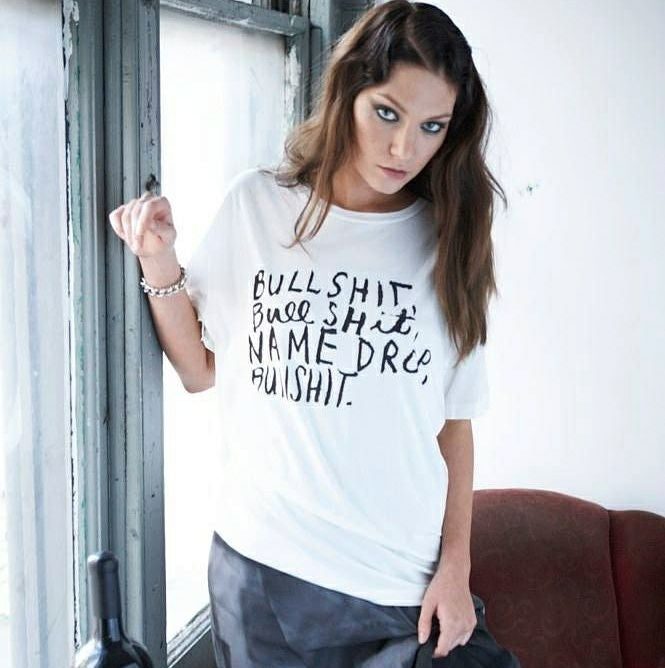 The hugely popular tee was showcased by Vanity Fair's George Wayne, Kim Kardashian, and photographer Peter Ruprecht on Fashion's Night Out in NY 2010 and strutted on the runway for the first time for their highly anticipated sold-out Skrapper fashion show by a then unknown undiscovered Shaun Ross, who went on to become one of the most famous male models in NY history.